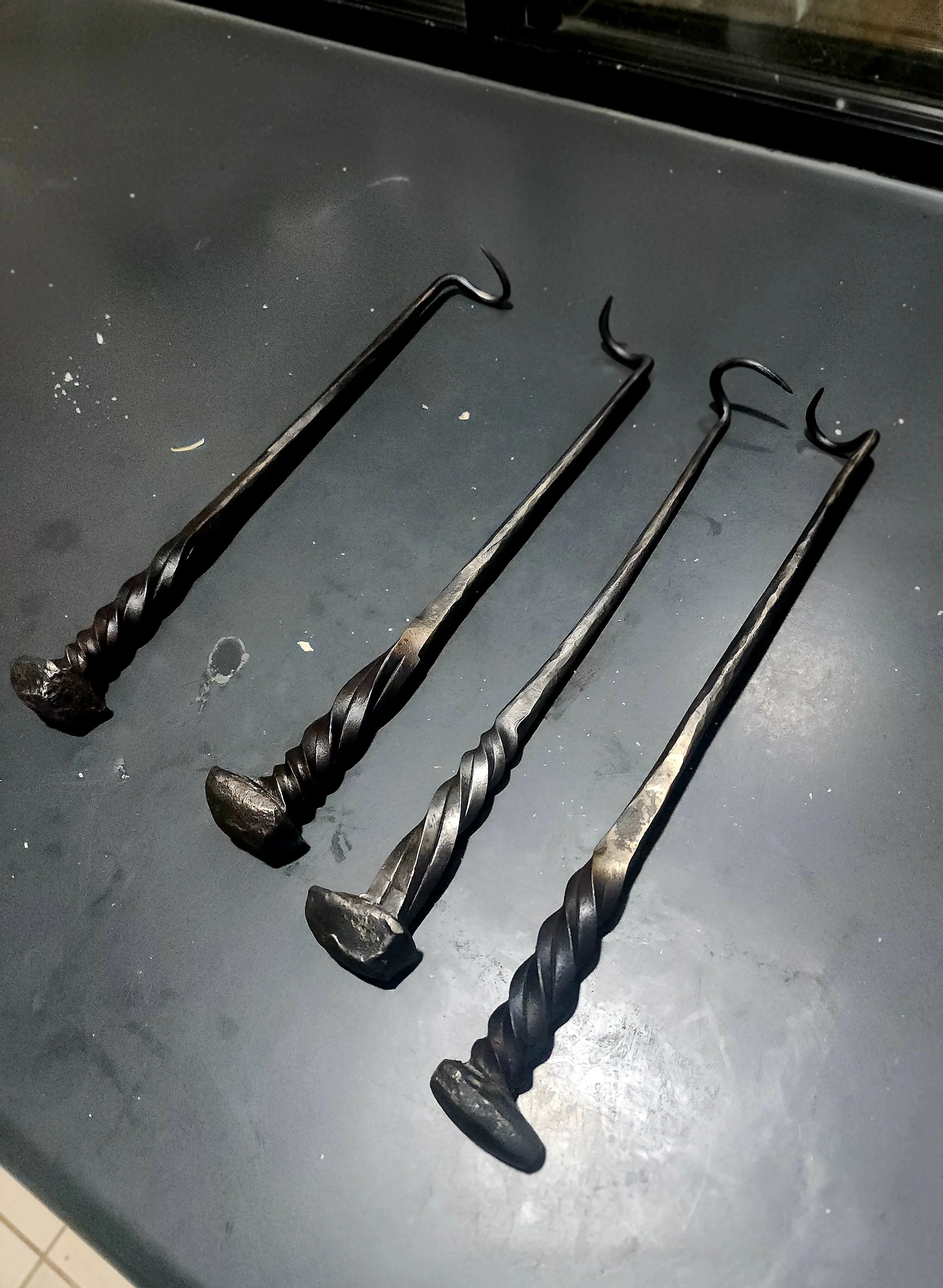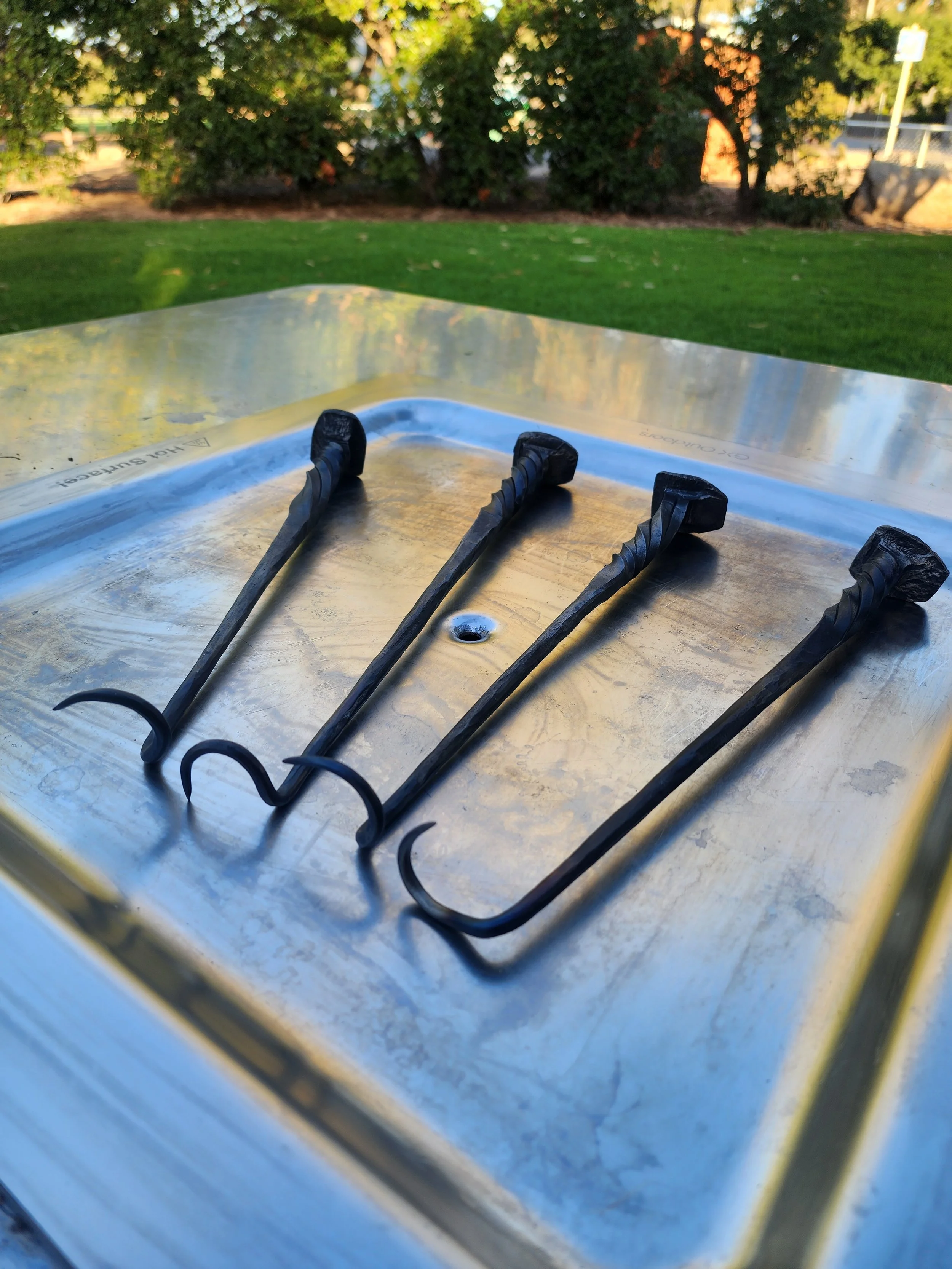 Cook your bbq in style with these hand forged steak flippers. Forged from a railway spike featuring a twisted handle.. a perfect gift for the man who has everything
